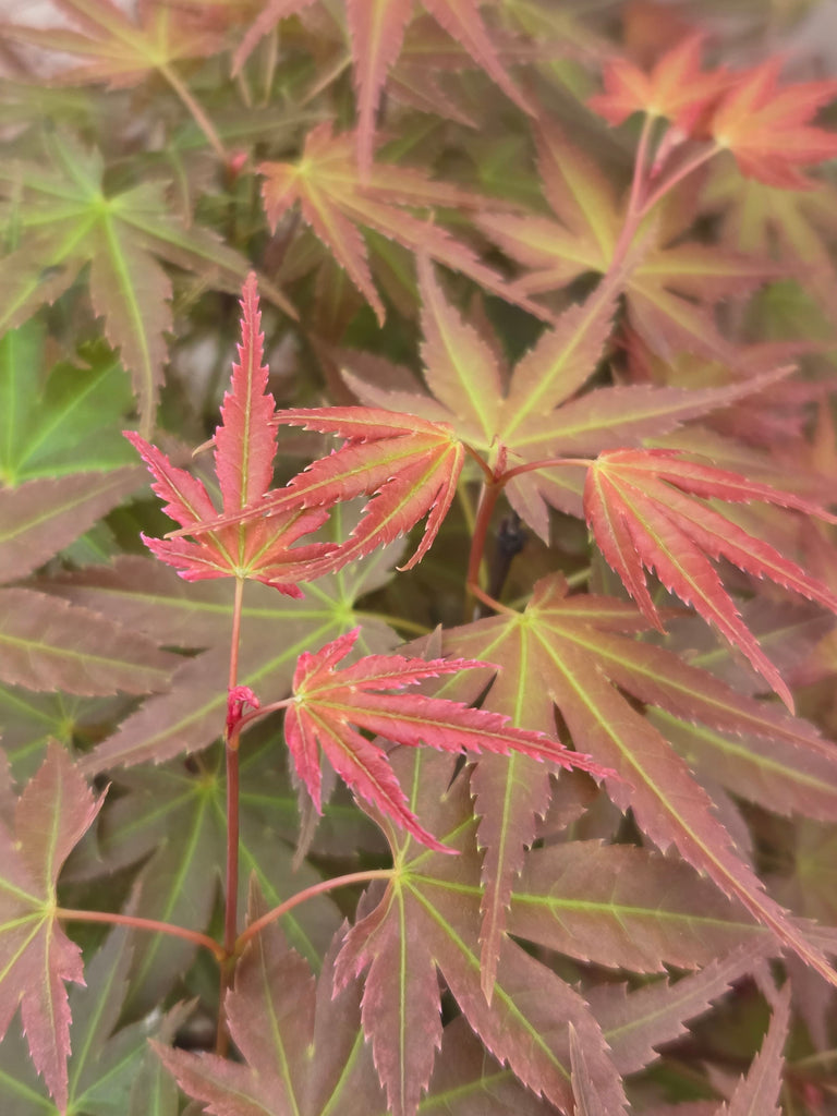 De acer palmatum phoenix is een in het oog springende soort. Het blad is in het voorjaar zacht rood met groene blad nerven