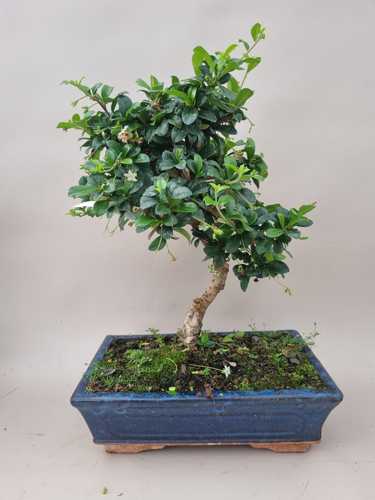 De bonsai carmona is een hele mooie makkelijke soort voor de bonsai. In de zomer komen er kleine witte bloempjes in de boom. Zorg voor een mooie lichte standplaats. Geef regelmatig water en plantvoeding. De bonsai wordt elk jaar mooier en voller. Hoogte boompje 35 cm. De boom wordt geleverd in stenen bonsai schaal.
