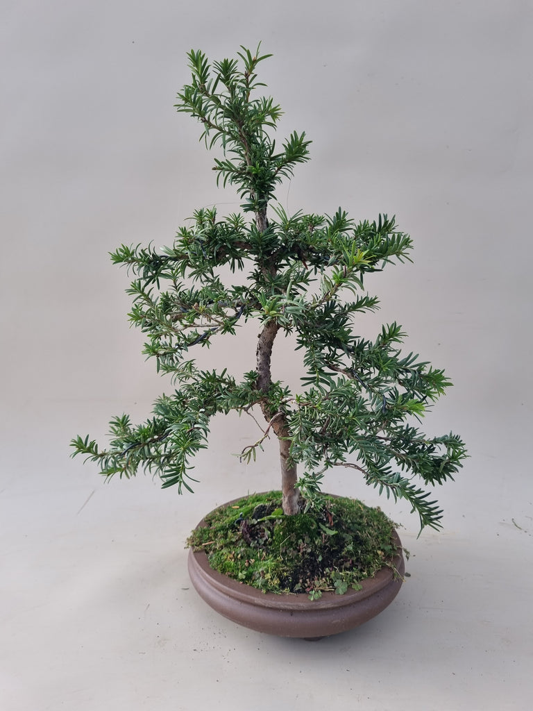 bonsai van de taxus hicksii. Het bonsai boompje is ongeveer 35 cm hoog en 8 jaar in training. De plateaus beginnen al aardig vorm te krijgen. De boom staat in een ronde Yixing pot.