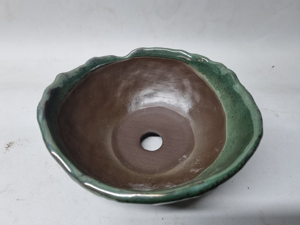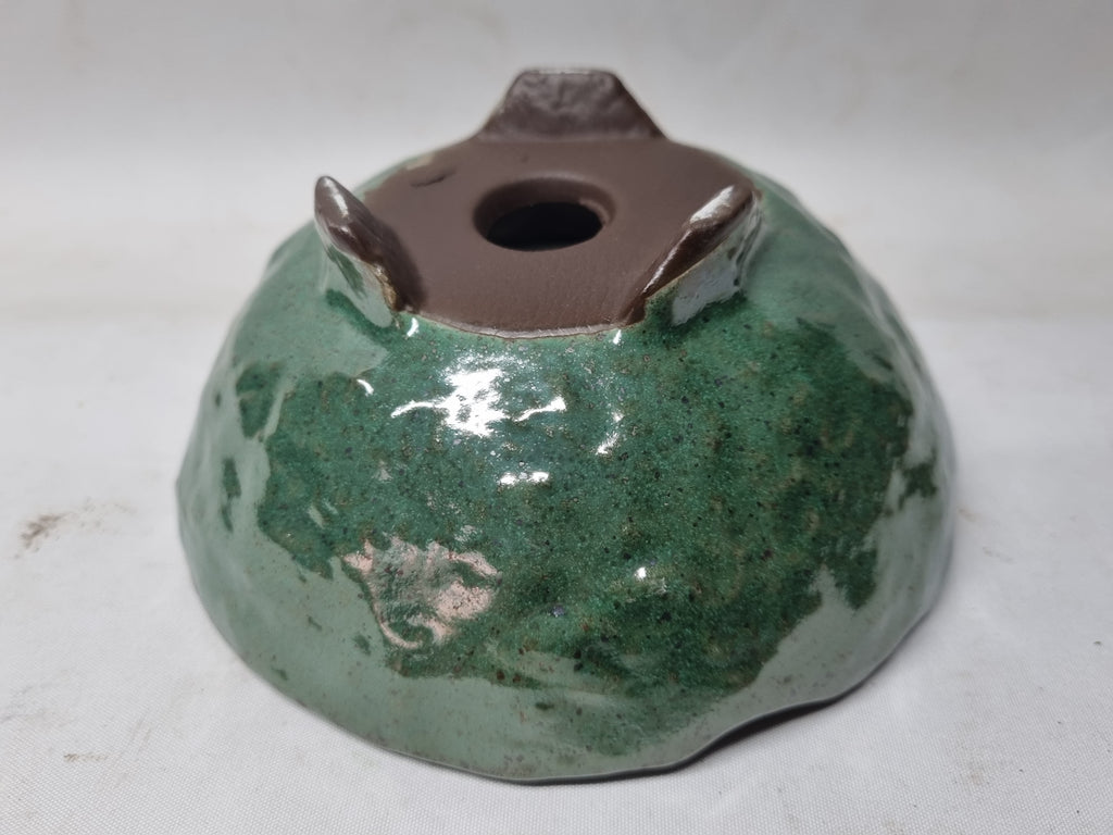 Japanse kusamono bonsai pot. Rond groen geglazuurde pot. Rond 15cm hoogte 7 cm. Het is Japans aardewerk extra hard gebakken.